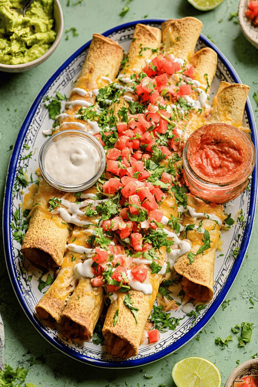 Taquitos crocantes recheados com mistura cremosa de feijão, queijo e creme azedo, temperados com especiarias mexicanas e um toque picante. O segredo está na combinação de texturas: a casquinha dourada e crocante contrastando com o interior macio e saboroso. Preparação rápida; assados até ficarem dourados, com aromas que lembram cozinha caseira mexicana. Acompanhamentos frescos dão o toque final.