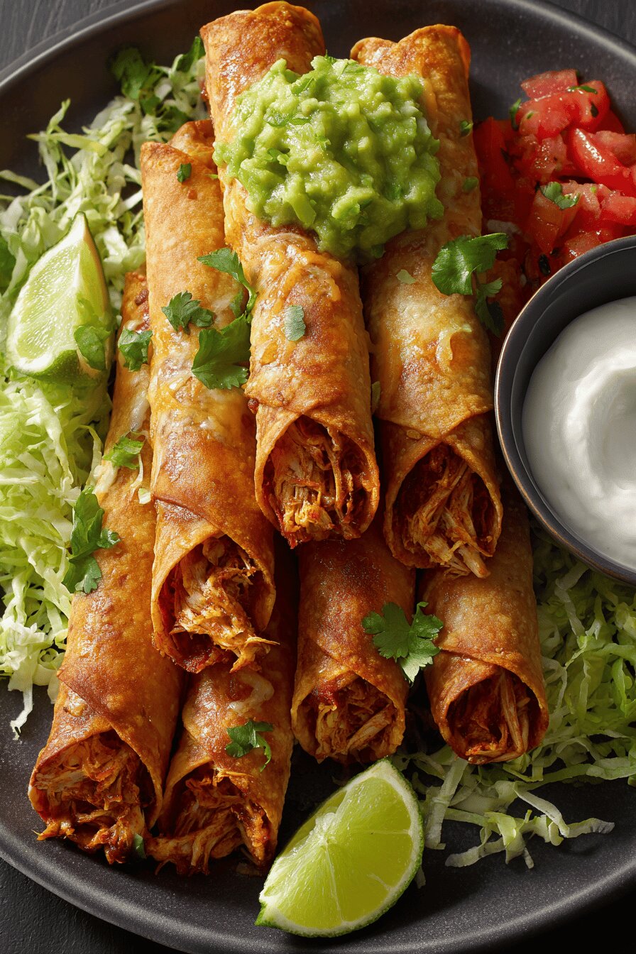 Taquitos recheados com frango bem temperado e queijo tex-mex, enrolados em tortillas macias e dourados na frigideira até ficar crocante. Servidos com guacamole cremoso de abacate com toque de limão e pimenta jalapeño, acompanhados de alface crocante, salsa e creme azedo. Versão rápida, simples, sem nozes e ovos, com ingredientes ajustados para mais sabor e textura. Ideal para almoço ou jantar informal. Receita pensada para quem busca sabor intenso sem complicação, com truques para evitar que as tortillas se abram, e dicas para deixar o recheio mais úmido e saboroso, mesmo se sobrar frango de outra preparação.