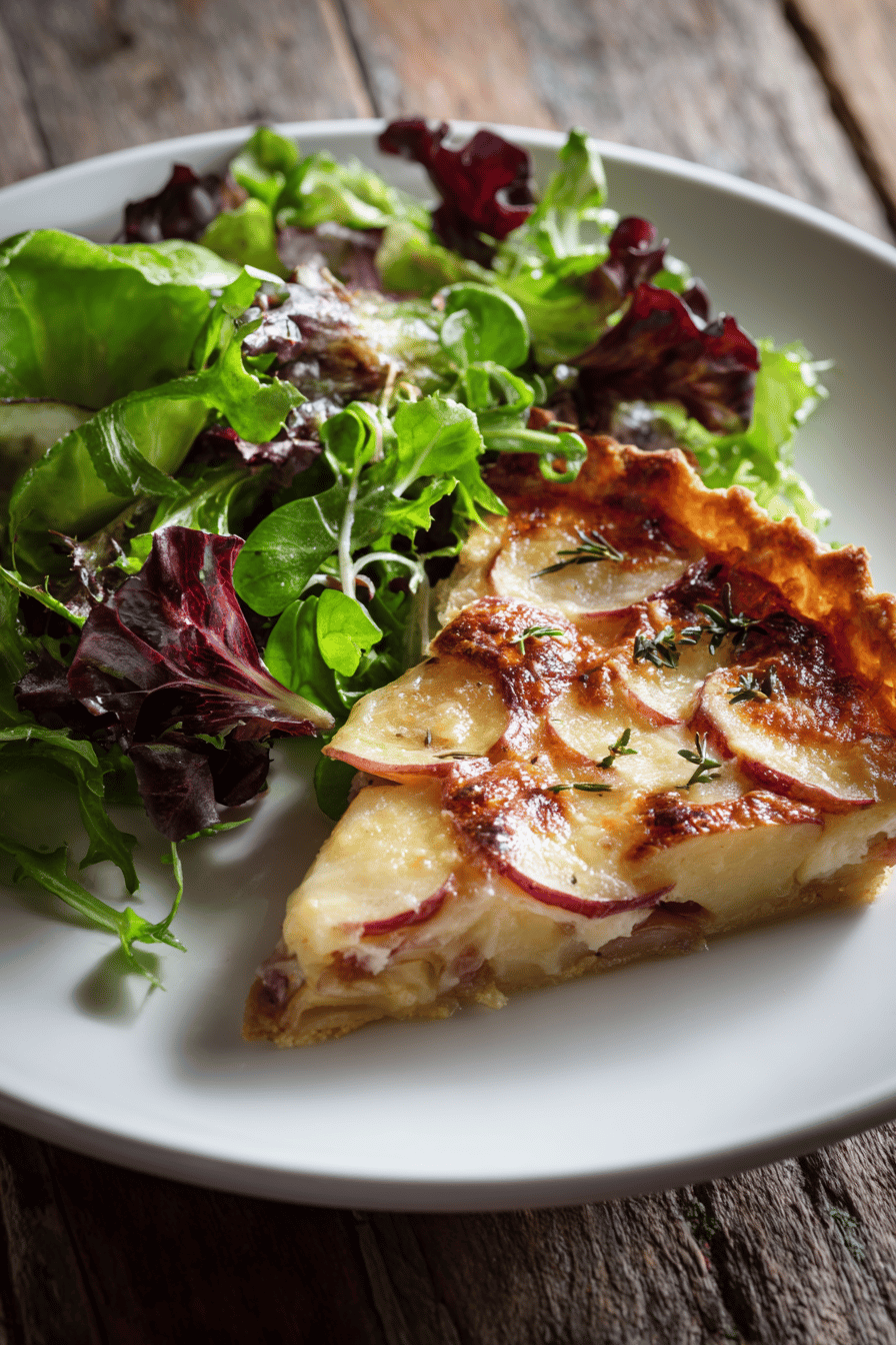 Uma tarte fina de batatas Yukon Gold em fatias finíssimas, assadas com queijo gruyère e um toque de parmesão, finalizada com uma salada mesclun temperada numa vinagrete de azeite, mostarda e molho inglês. Receita sem glúten, sem ovos e sem nozes, com variações que trazem um sabor mais rústico ou frescor extra, dependendo do ingrediente adicional escolhido. Preparação rápida, foco nos sinais visuais e textura para garantir a crocância do topo e maciez interna.