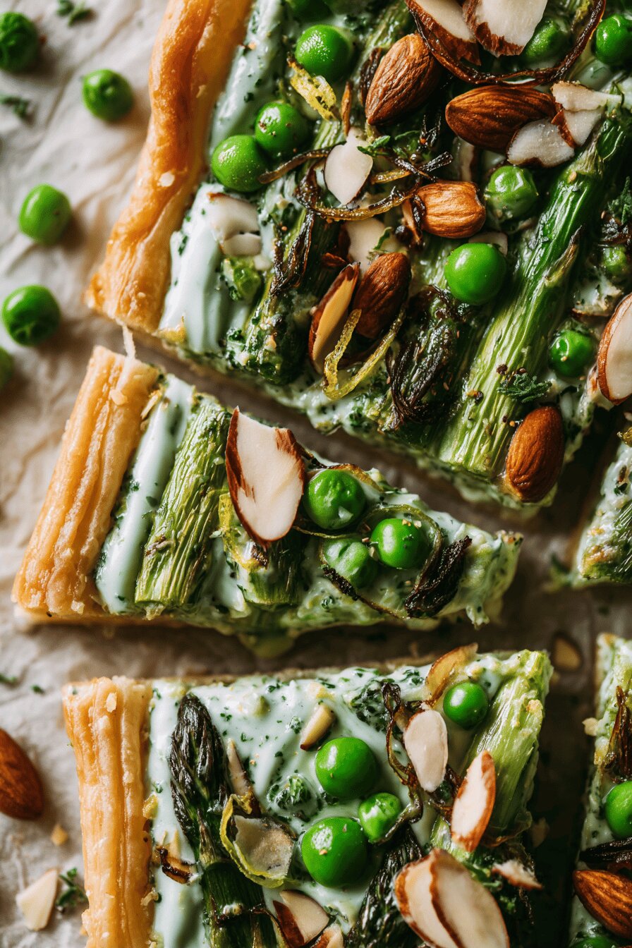 Massa folhada com creme vegetal, aspargos finos e ervilhas frescas. Adiciona cebola roxa marinada no vinagre de maçã e no lugar da amêndoa, nozes pecan torradas. Ervas frescas como cebolinha e coentro substituem o tomilho, com raspas de limão siciliano para toque cítrico. Assa por 20 a 28 minutos para massa dourada e textura crocante. Entrada leve, sem laticínios nem ovos, para 4 a 6 pessoas. Receita rápida, sabor marcante e coloração vibrante.