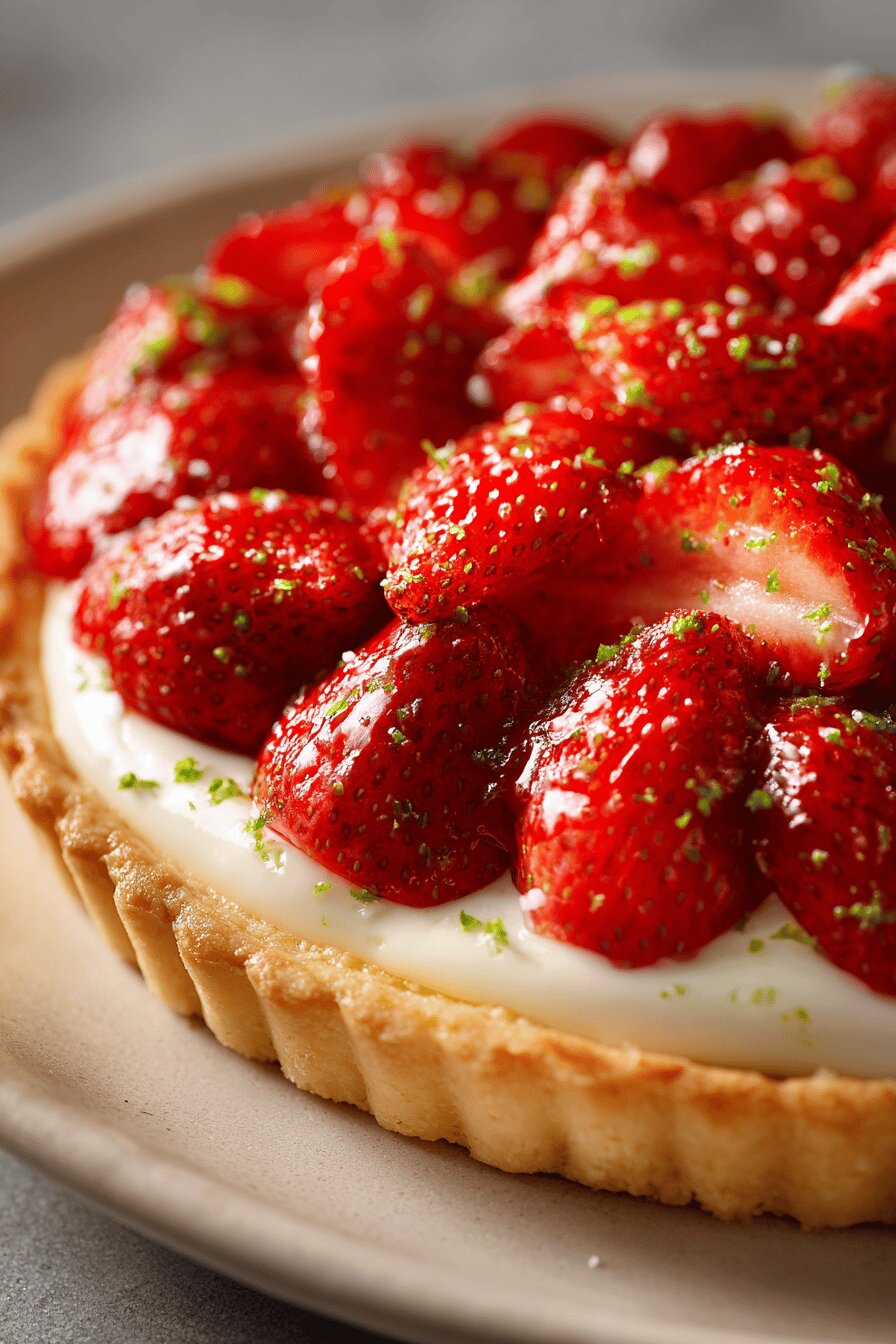 Torta simples com massa amanteigada com toque de limão siciliano. Cobertura cremosa de mascarpone batido com creme de leite fresco. Morangos frescos marinados com açúcar e hortelã, trazendo frescor ao doce. Massa assada até dourar levemente, recheio cremoso e frutas suculentas. Sem ovos, sem nozes, versão adaptada com açúcar demerara e toque de baunilha natural. Texturas que contrastam: crocante, cremoso, fresco. Rápido de preparar, refrigeração curta para manter frescor. Doçura na medida, leve aroma cítrico, simples de fazer para qualquer ocasião.