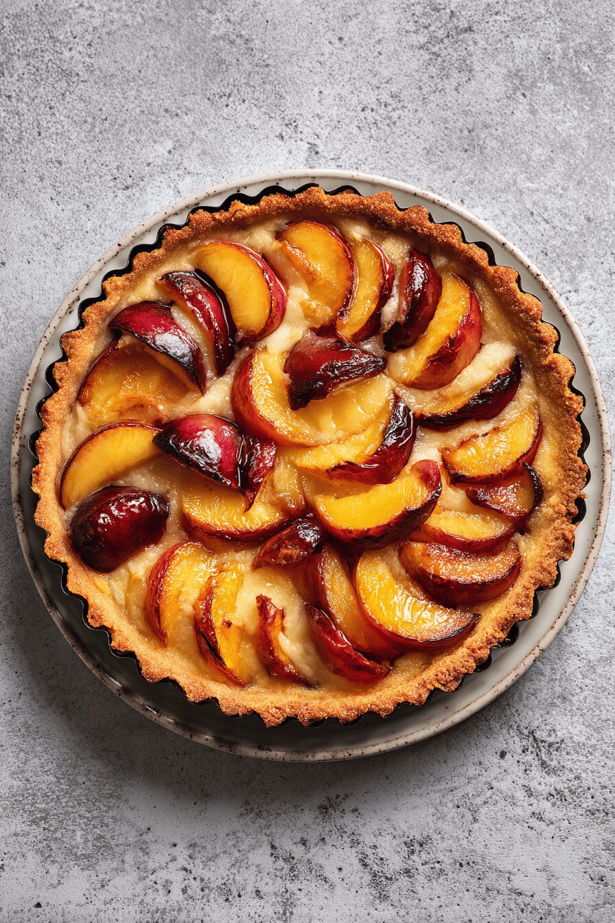 Uma torta rústica feita com uma massa simples, crocante e amanteigada, recheada com uma mistura suculenta de nectarinas, pêssegos e damascos. A doçura natural das frutas é equilibrada pela leve acidez e a textura da crosta dá aquele contraste bom. Cozida até a borda dourar e os sucos borbulharem, resultando num aroma convidativo e visual rústico que remete à cozinha caseira e campestre.