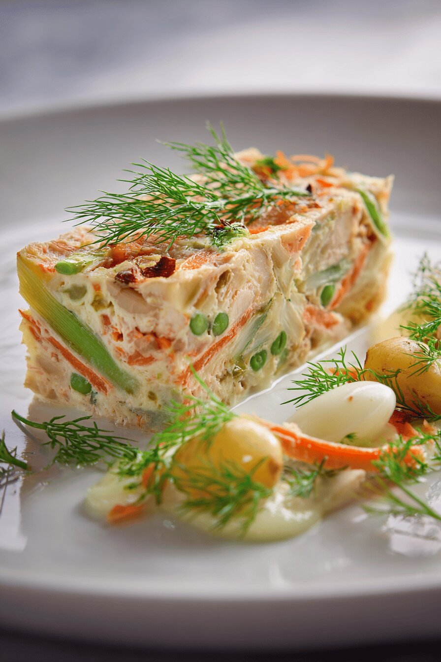 Terrine feita com filés frescos de peixe branco substituindo por filés de tilápia e substituindo creme de 35% por creme de leite fresco. Legumes diferentes, usando ervilhas tortas no lugar das asperges, e cenoura manteve, mas em cubos. Cozimento feito em banho-maria, leve variação no tempo para garantir textura firme e úmida, ideal para servir fria com pão artesanal. Rende seis a oito porções. Técnica útil para capturar o sabor delicado do peixe sem perder a suculência. Perceba a textura aveludada pronta pelo tato, e o aroma sutil do creme com ervas frescas.