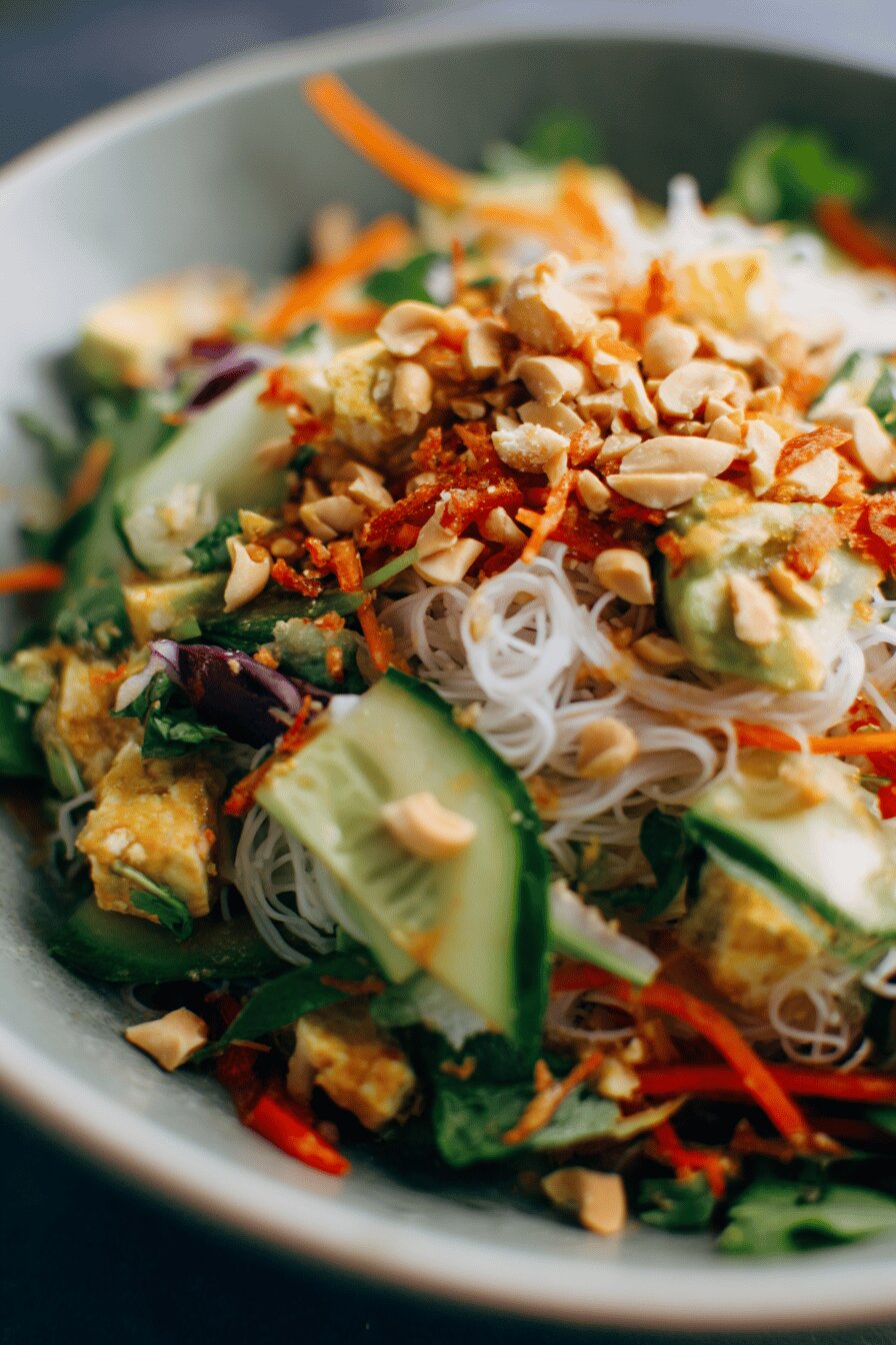 Salada refrescante com vermicelli de arroz, tofu sedoso desfiado, concombros picados e abacate; tudo regado com um molho de amendoim temperado com alho, molho shoyu reduzido, vinagre de arroz, açúcar e toque picante. Troca das castanhas por amendoim torrado e substituição do óleo vegetal por azeite de oliva para um sabor levemente diferente. Receita fácil, rápida e sem ingredientes de origem animal, sem lactose, nem ovos, com leves ajustes no tempo de cozimento e descanso para uma textura melhor.