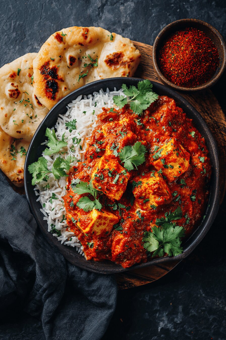 Um prato vegetariano inspirado no clássico frango ao molho manteiga. Usa tofu firme, cozido e dourado para textura firme e cremosa. Molho com tomate, especiarias do garam masala, páprica e um toque de noz-moscada, finalizado com creme para suavizar. Receita sem ovos, sem nozes, sem glúten, ideal para quem busca proteínas vegetais saborosas. Atenção ao ponto do tofu e ao equilíbrio das especiarias para textura e sabor marcantes. Versátil, acompanha arroz basmati e legumes. Fácil adaptação para quem não tem pasta de tomate, pode usar extrato com água e ajustar sal.