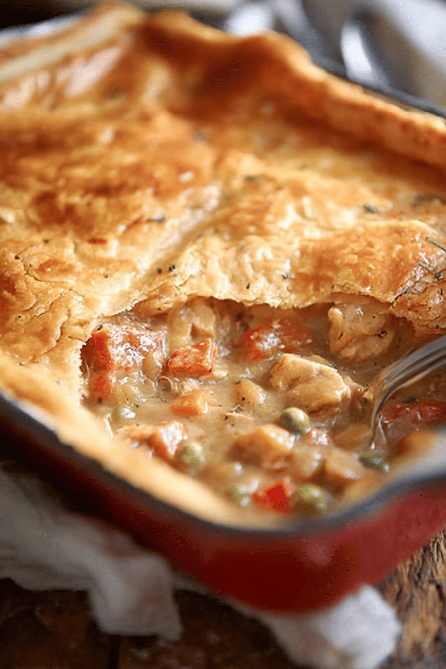 Uma torta cremosa e rústica que mistura frango, legumes frescos e tempero vibrante, coberta por uma massa folhada dourada. Usa caldo de galinha caseiro e substitui o peru por frango desfiado para um toque mais leve. O segredo está em cozinhar os legumes até ficarem macios, mas firmes, e engrossar o molho com um roux perfeito. O tempero umami da páprica defumada substitui o Tony Chachere’s trazendo um sabor único e levemente defumado. Perfeita para dias mais frios, essa receita traz conforto e textura, ainda fácil de preparar no dia a dia.