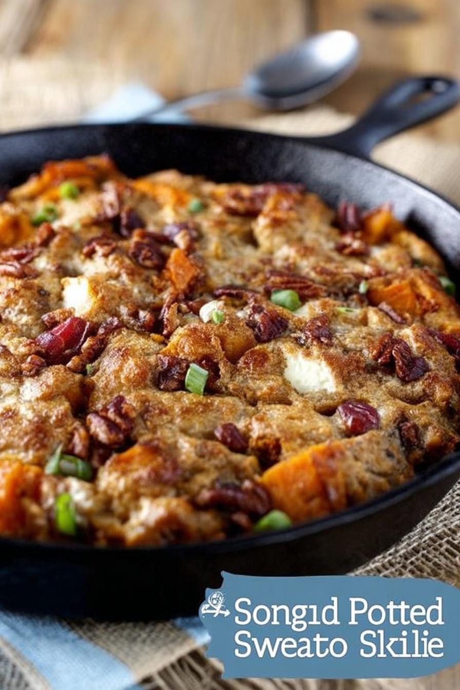 Bolo de batata-doce assado no skillet de ferro ou forma tradicional, com recheio cremoso de queijo, coberto por farofa crocante. Ajustaçōes no açúcar e tijolos para dar textura mais crocante, troca básica no ingrediente para sabor e textura. Tempo de forno variado de acordo com o dourado observado. Serve 8 pedaços generosos. Ideal para servir morno ou em temperatura ambiente.
