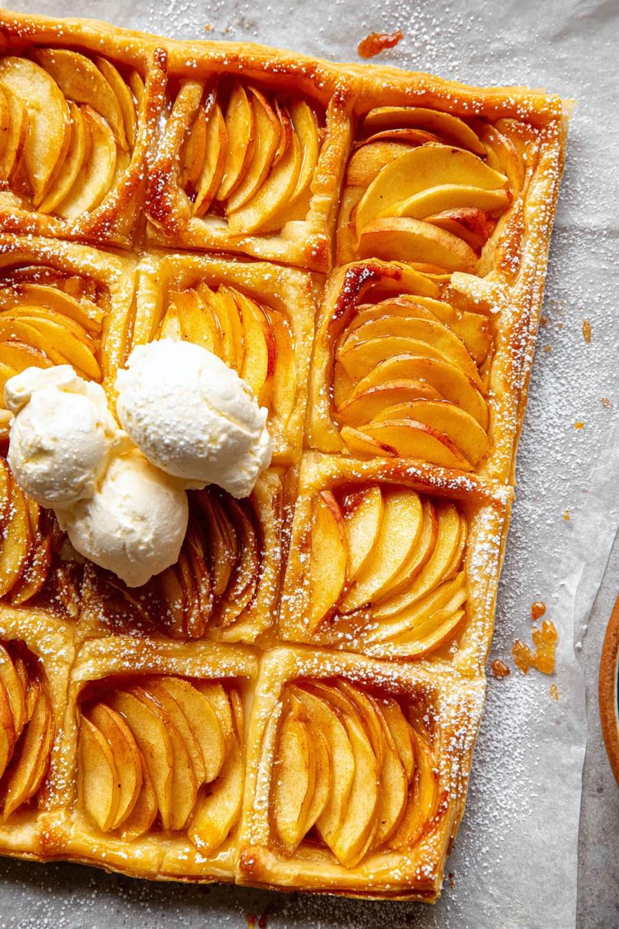 Massa folhada descongelada em temperatura ambiente, fatias de maçã com 5% menos açúcar, trocando noz-moscada por cardamomo para um aroma mais cítrico e refrescante. Passos reorganizados para otimizar fluxo, incorporando dicas para não deixar a massa grudar nem perder a crocância. Tempero medido ao olho, textura das maçãs no ponto, cobertura de geleia de damasco aquecida para brilho intenso. Forno a 200°C, uns minutos a mais para dourar melhor. Finalização com manteiga em cubinhos distribuída com calma para não amolecer as fatias. Serve 12 pedaços, sabor marcante, massa crocante com toques de especiarias e doçura equilibrada.