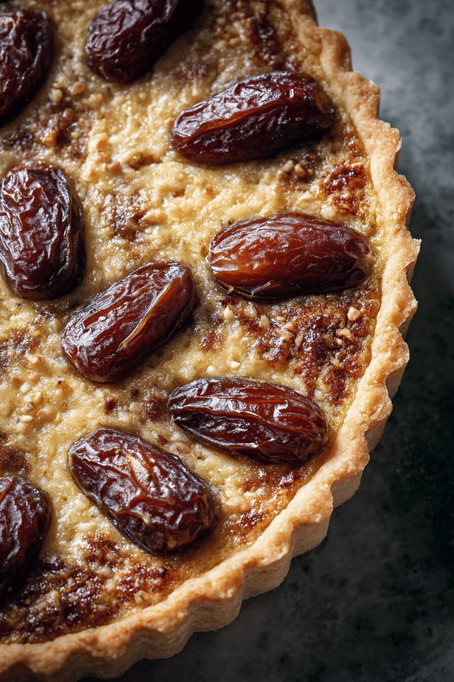 Torta doce com massa quebradiça e recheio cremoso de tâmaras Medjool. Troca o leite por creme de coco e usa açúcar mascavo escuro. Massa mais farinha integral misturada com farinha branca. Recheio com toque de extrato de amêndoas substitui a baunilha. Duração total em torno de 1h25min. Serve 8 pessoas. Boa para quem gosta de sobremesas vegetarianas e sem nozes. Textura aveludada no recheio, tâmaras inteiras espalhadas por cima e sabor marcante do coco e amêndoas que trazem frescor diferente. Com forno em 175°C para assar por aproximadamente 55 minutos.