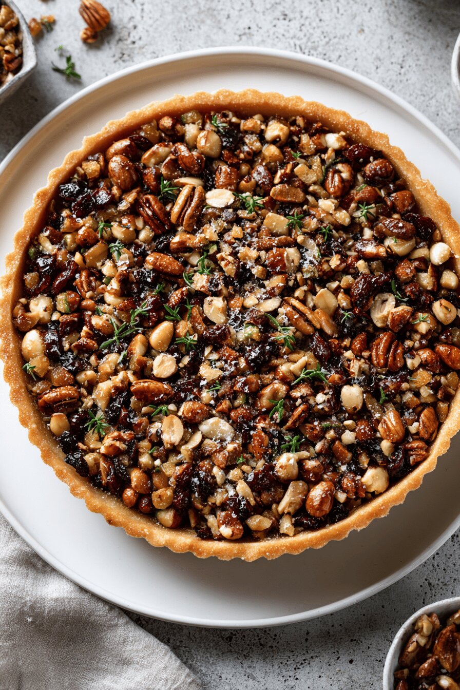 Torta doce com base crocante de massa amanteigada, recheada com mistura rica de nozes tostadas, frutas secas, pasta de amêndoas e um toque de rum. Processo envolve pré-cozimento da massa para evitar que fique encharcada, depois recheio cremoso com textura firme e sabor complexo. Receita adapta nozes e frutas conforme o que tiver disponível, oferece aroma cítrico pela casca de laranja e um equilíbrio entre doçura e leve acidez das frutas. Ideal para sobremesa em épocas festivas ou para impressionar com ingredientes simples e resultados sofisticados.