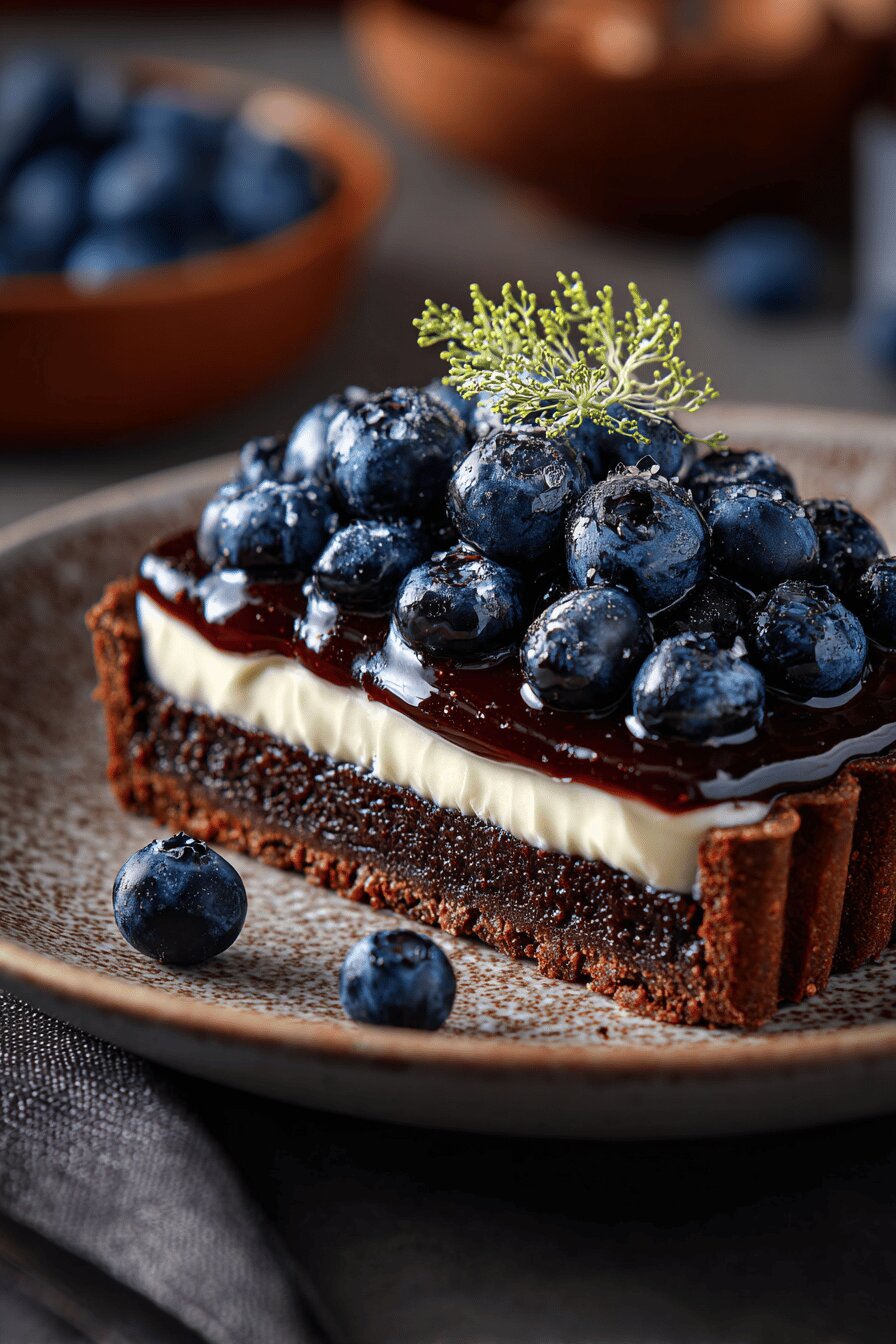 Combinação de crosta crocante feita com bolacha de chocolate e toque de flor de sal, creme de chocolate amargo enriquecido com blueberries frescos, chantilly saborizado com chocolate branco e geleia aveludada de mirtilo com textura firme e brilho natural. Uma sobremesa que brinca com texturas e sabores intensos sem nozes e com toque de frutas frescas para decorar. Técnica que prioriza sinais visuais e táteis para dominar o ponto ideal em cada etapa, garantindo equilíbrio entre doçura e amargor.
