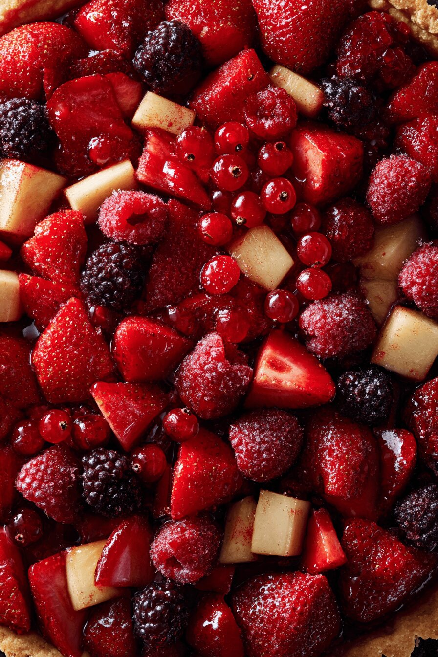 Torta combinando frutas vermelhas congeladas, maçãs cortadas em cubos e um toque de gengibre fresco e em pó na massa. Cobertura crocante com açúcar mascavo e especiarias, assada até dourar. Revela mistura agridoce, textura macia da fruta e crocância da crosta. Tempo de preparo total aproximado de 1h15. Rende 8 porções generosas. Ideal para sobremesa com cafés e chás, mantém até quatro dias refrigerada. Alteração na quantidade de ingredientes para equilibrar sabor e textura, substituição de cranberry por mirtilo e acréscimo de raspas de limão para frescor.