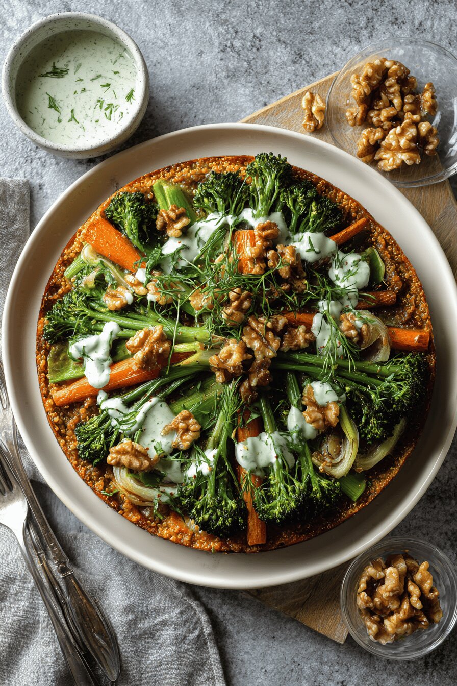 Torta salgada que combina batata-doce amassada com quinoa crua, especiarias e farinha para dar liga. Cobertura colorida com legumes refogados como cenoura, alho-poró, brócolis e couve-de-bruxelas, finalizada com nozes pecã torradas e um toque ácido de limão. Molho cremoso de iogurte com ervas frescas traz frescor e leveza. Nada de ovos, só plant power aqui. Assa até dourar, firmar e soltar aquele perfume que te chama. Nutritiva, vegana, balanceada, fácil e cheia de texturas que se completam. Um prato principal que vai bem com uma saladona verde e pão crocante. Leve e rica em fibras e proteínas, boa para quem quer sair da mesmice.