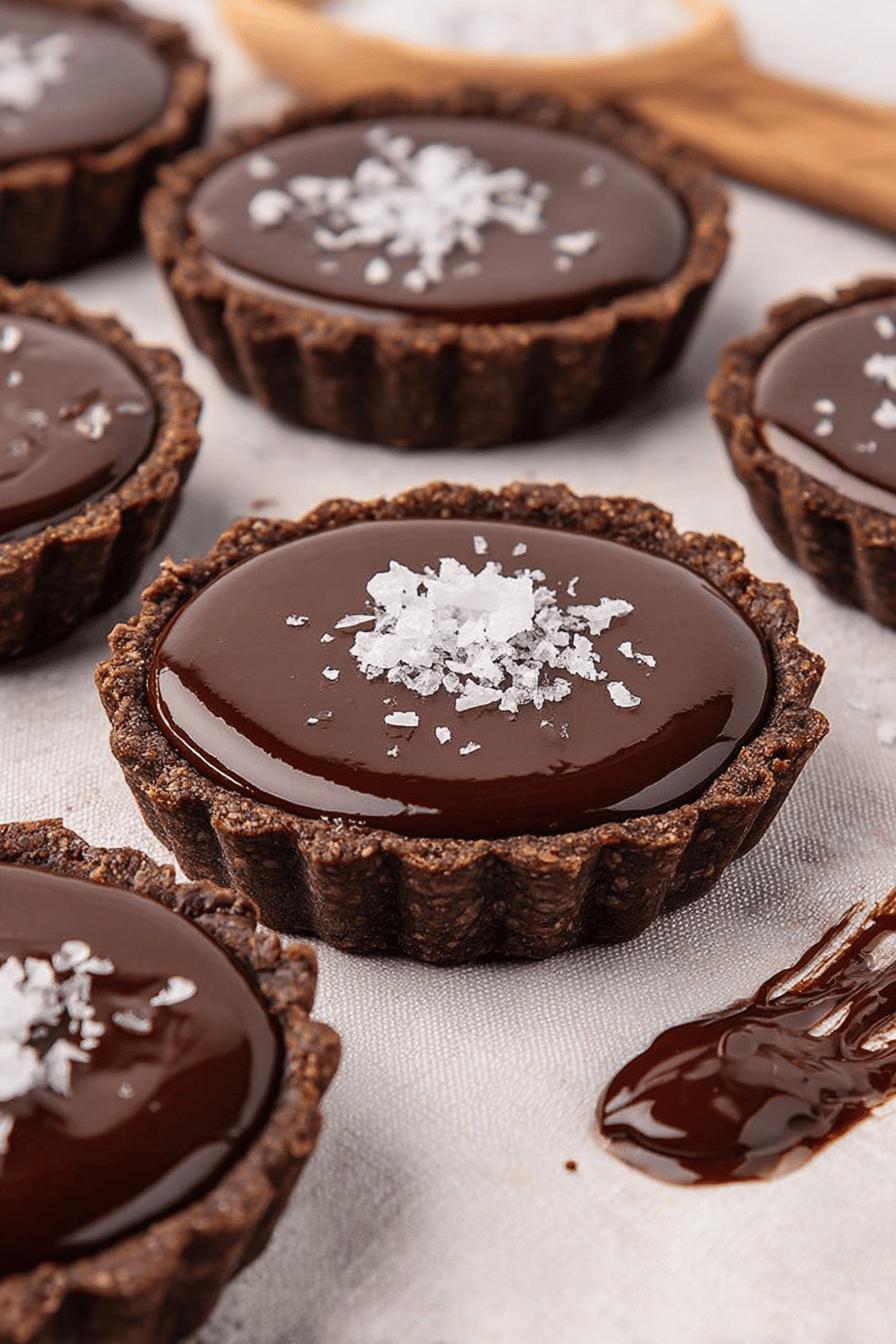 Importante prestar atenção no ponto da massa no processador - deve parecer areia úmida, não uma massa coesa; isso evita que as tortinhas fiquem duras. O passo de furar a massa e usar peso para assar é vital para não formar bolhas no fundo, principalmente porque a base é fina. Retirar o papel na metade do tempo ajuda a casquinha ganhar cor e textura, peça do sabor. Para o ganache, conferir se o creme está quase fervendo, mas nunca fervido, pois o chocolate pode perder brilho e textura. Deixar repousar antes de bater evita formação de grumos. A geladeira firma o recheio, mas cuidado ao congelar pois pode alterar a estrutura. Na hora de desenformar, use uma faca fina para descolar as bordas, evita que quebrem. Finalizar com flor de sal é truque de chefe para realçar sabores e surpreender, experimente.