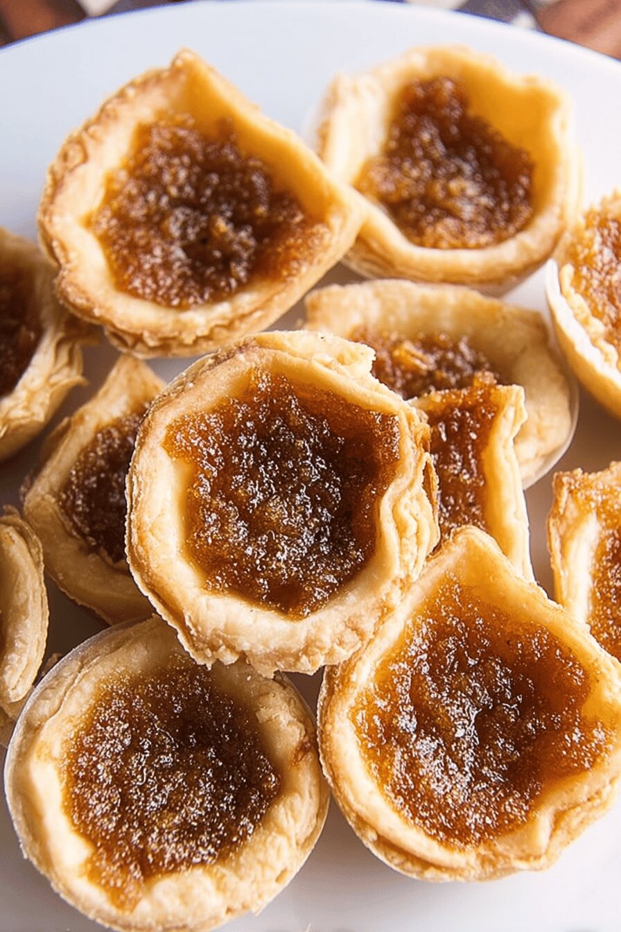 Tortinhas açucaradas canadianas com massa crocante e recheio cremoso de melado. Massa feita com farinha, manteiga gelada e toque de açúcar; recheio cremoso com manteiga, açúcar mascavo, ovos, xarope de bordo e um toque de baunilha. Assa rápido em forno quente até firmar mas ainda ligeiramente pegajoso no centro. Processo que exige massa bem fria para segurar a forma e recheio fluido que vira luxo ao assar. Receita adaptada com noz-pecã no lugar de xarope tradicional para dar um twist de sabor e textura. Serve 15 unidades, ideal para lanche ou café da tarde.