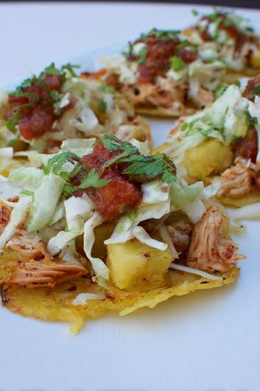 Frango cozido lentamente com legumes aromáticos, depois combinado com abóbora espaguete suculenta, servida sobre tortilhas crocantes e finalizada com repolho fresco, cebolinha e salsa caseira. Uma mistura de texturas e sabores que une o comfort food ao frescor, com toques que vão do adocicado da abóbora à crocância das tortilhas. Ideal pra quem gosta de pratos versáteis, fáceis de fazer na slow cooker, mas com resultado cheio de personalidade.