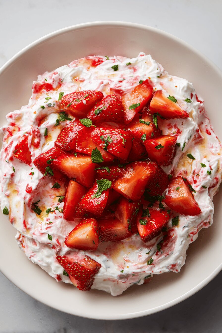 Uma mistura refrescante com iogurte grego adaptado, morangos macerados em suco e mel, uma pitada de laranja e ervas frescas que dão um toque inesperado. Texturas que dançam entre o cremoso e o suculento com aroma cítrico. Serve como entrada leve ou sobremesa sem complicação, incluindo alternativas para quem não tem iogurte grego à mão e troca sutil de baunilha por amêndoa, para um perfil aromático diferente sem perder o charme.