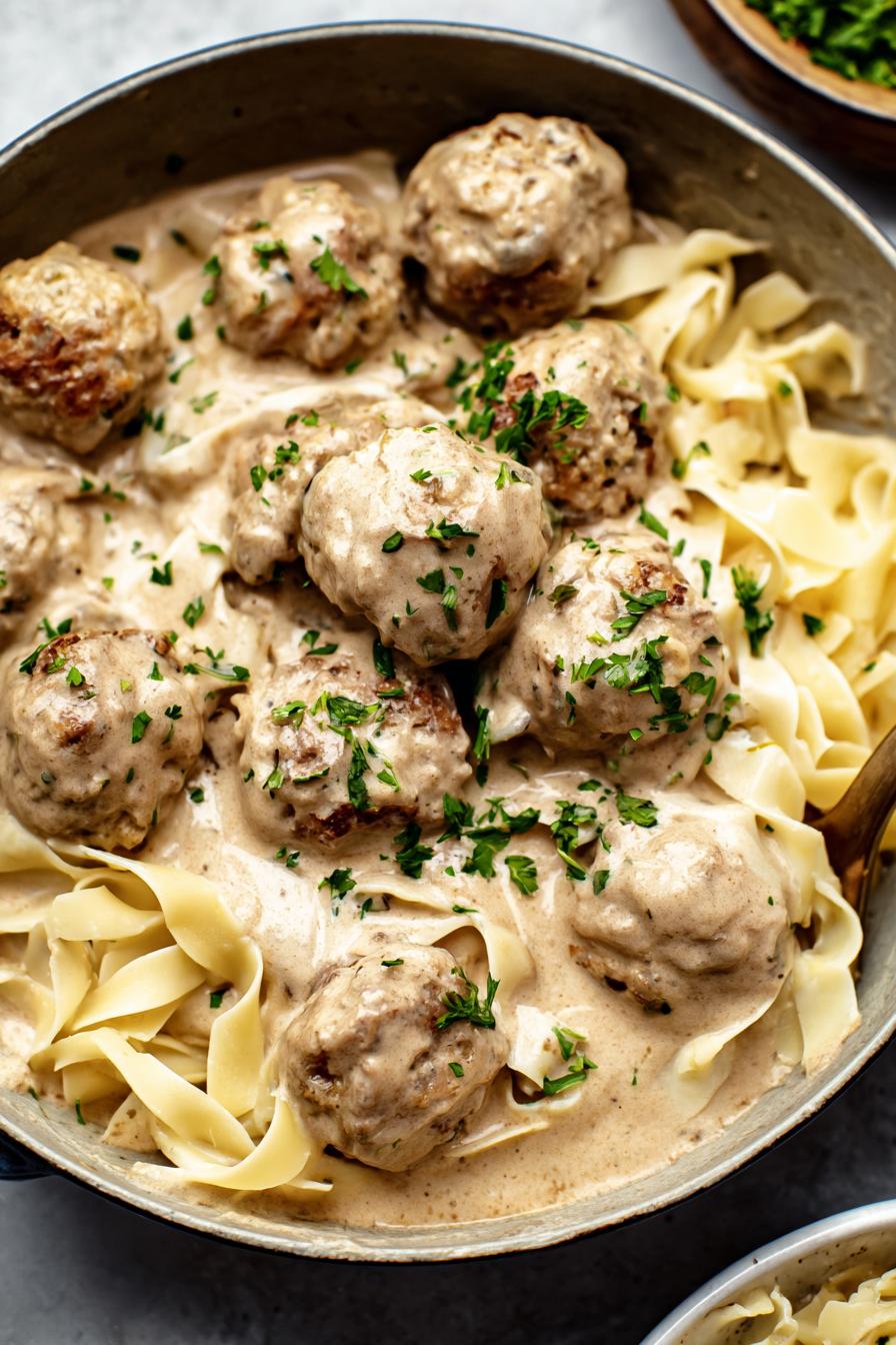 Almôndegas feitas com peru moído, assadas e finalizadas num molho cremoso à base de creme de leite e iogurte. Temperadas com cebola, salsinha, molho de soja e especiarias, combinadas com um roux para dar textura ao molho. Servidas com massa larga, purê de batata ou outro acompanhamento confortável. Uma mistura de sabores que traz o conforto da casa com um toque moderno.