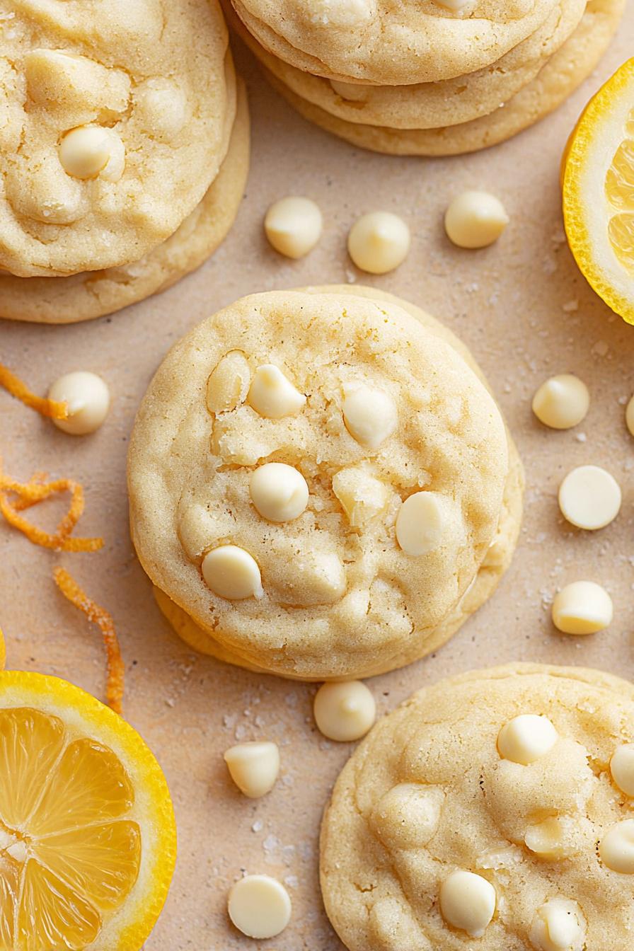 Cookie com açúcar aromatizado com raspas de limão e capim-santo para uma explosão cítrica diferente. Manteiga batida com o açúcar para textura leve, farinha combinada com amido de batata para maciez. Adição de creme de leite azedo para umidade e leve acidez, substituindo parte da farinha por farinha de aveia para um toque rústico. Contém chocolate branco para contraste doce e cremoso. Massa deve descansar para firmar, facilitando o manuseio e despertar sabores. Assar até bordas quase dourarem, cuidando para não secar. Finalizar com glacê de limão generoso, para brilho e umidade, com pitadas extras de raspas e pedacinhos de chocolate por cima.