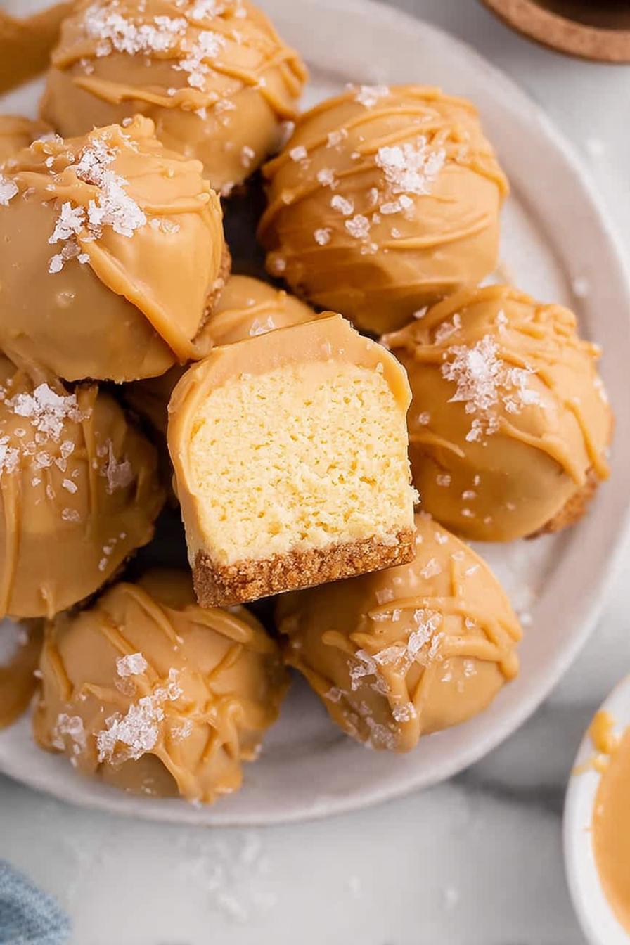 Bocadinhos de cheesecake com sabor de caramelo, usando mistura de bolo tratada termicamente para textura perfeita. A mistura seca esquenta no micro-ondas em intervalos para evitar bactérias, depois incorporada no cream cheese batido com essência de caramelo. Resfria bem, enrola bolinhas e banha em cobertura derretida sabor caramelo salgado. Receita rende 28 porções pequenas, textura cremosa com crocância do chocolate, ideal pra petiscar. Calorias moderadas por porção, bom equilíbrio entre gordura, açúcar e proteína. Cuidado com temperatura e umidade na hora de derreter a cobertura pra não empelotar.