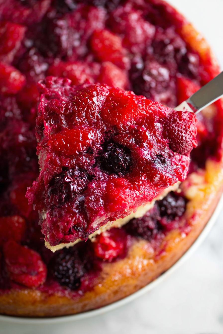 Bolo assado com camada crocante de açúcar mascavo e manteiga, coberto por frutas vermelhas frescas. Massa leve com toque de limão e baunilha. Assar até furar e sair limpo. Pode usar frutas congeladas se frescas sumirem. Troque leite por leite de coco para um sabor diferente. Servir quente ou frio polvilhado com açúcar de confeiteiro. Texturas variadas entre o cremoso da massa e a fruta macia. Surpreende no sabor e visual com sua camada invertida chamativa.