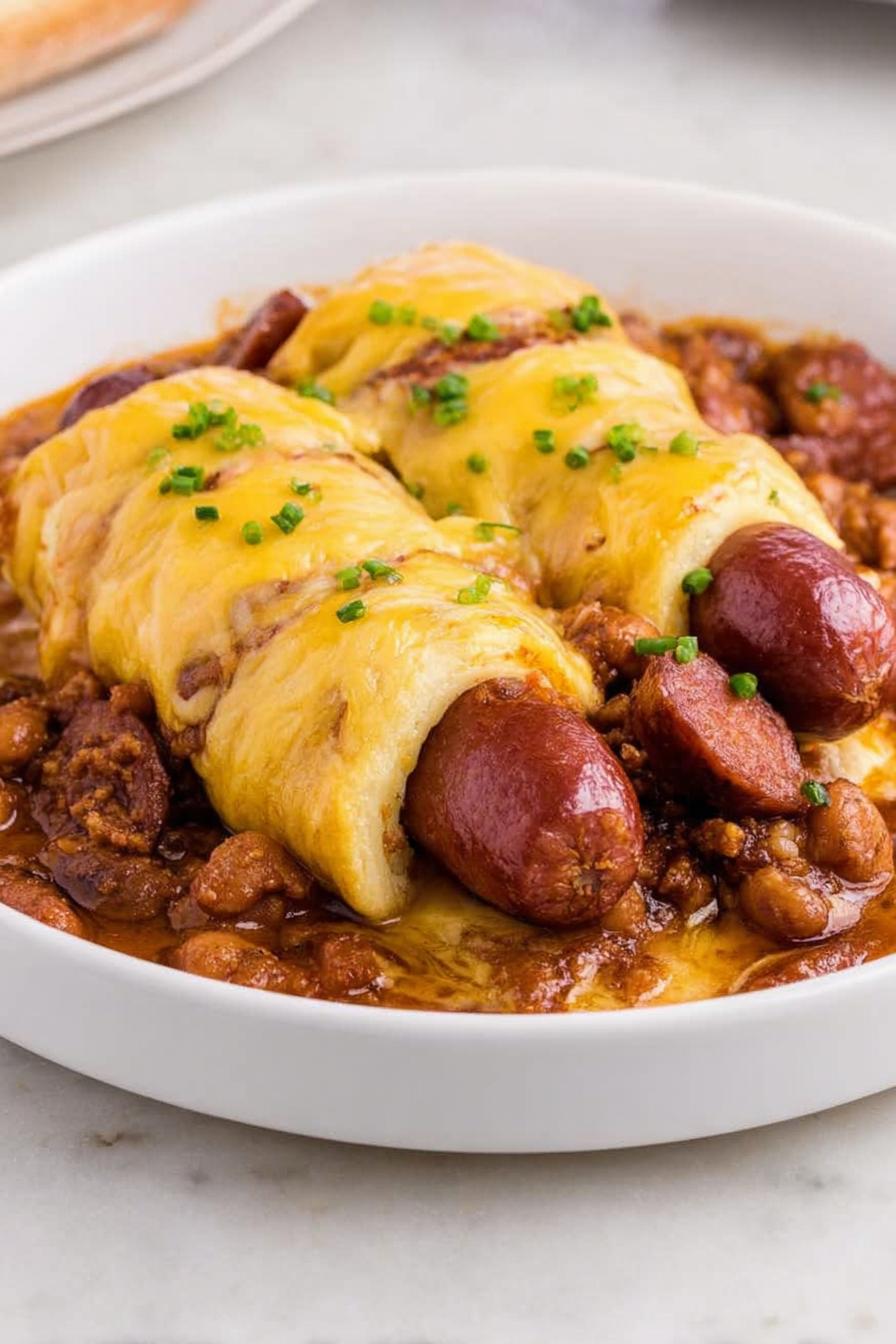 Salsichas envoltas em massa folhada recheadas com queijo, assadas com molho chili ao redor, criam um lanche recheado de sabores e texturas. Massa dourada, queijo derretido, salsicha suculenta e chili picante. Fácil, rápido, com toque de manteiga e alho pra finalizar. Serve 8, ideal pra reunião ou jantar informal. Substitua salsicha tradicional por toscana para mais sabor, ou use queijo muçarela extra se quiser mais cremosidade. O segredo é deixar espaço entre cada enrolado pra massa crescer sem grudar. Importante: o chili deve ser firme, não ralo, pra não afundar e deixar a base empapada. Mistura que explode de aroma e visual dourado por fora, cremoso e quente por dentro.