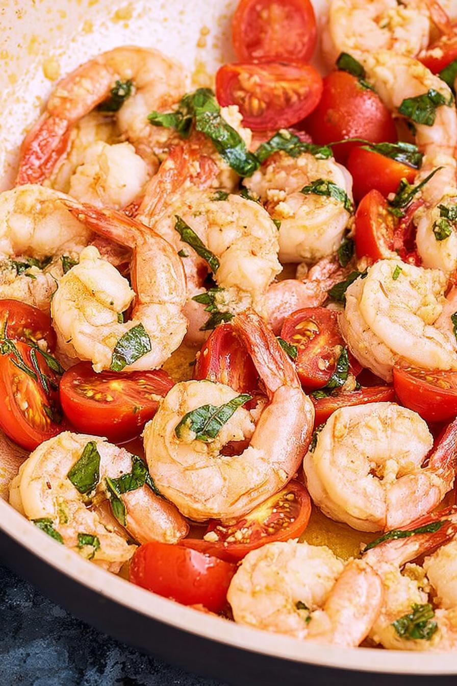Camarão salteado em frigideira com manteiga, alho, salsa e tomates cereja, servido sobre base à escolha como quinoa ou arroz. Técnica que privilegia controle da temperatura para evitar borracha no camarão e garantir crocância nas bordas. Aromas e texturas se destacam, trazendo suculência e brilho ao prato. Ingredientes adaptados para realçar frescor e sabor, com substituições recomendadas em caso de falta.