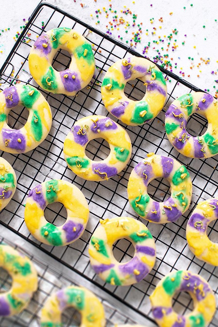 Biscoitos inspirados no King Cake, troquei noz-moscada por canela para uma pegada mais familiar. Massa leve, amanteigada, com textura firme que permite cortar e modelar fácil. Glacê real clássico, com toque de limão para dar acidez e balancear o doce, dividido em branco, amarelo, verde e roxo – cores do Mardi Gras adaptadas. Receita pensada para reconhecimento visual das texturas e pontos certos de forno, além de dicas para evitar massa grudenta e glacê escorrendo. Opção de usar farinha de aveia para dar um sabor diferente e mais fibra.