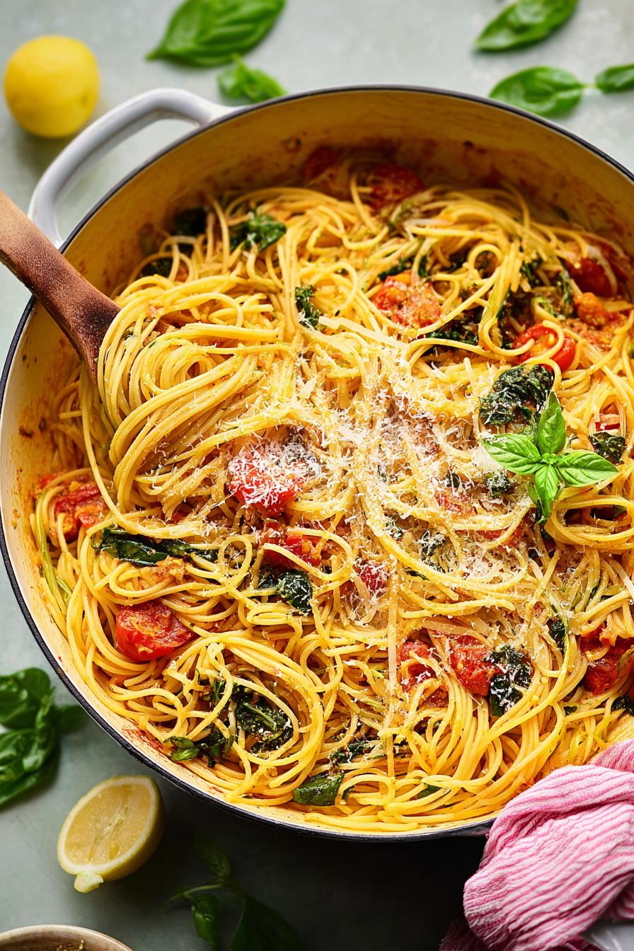 Um jeito rápido e sem frescura de fazer espaguete direto na frigideira, usando tomates frescos e caldo para cozinhar a massa junto. A receita troca o espinafre por couve manteiga, que deixa tudo com aquele amarguinho bacana. Raspas de limão e queijo parmesão ralado não podem faltar no final para abrir sabor e trazer cremosidade. Toques picosos com flocos de pimenta dão o tempero final. Cozinha prática em cerca de 25 minutos, serve até seis pessoas. Um clássico reimaginado para dias corridos, com dicas para ajustar a textura sem erro.