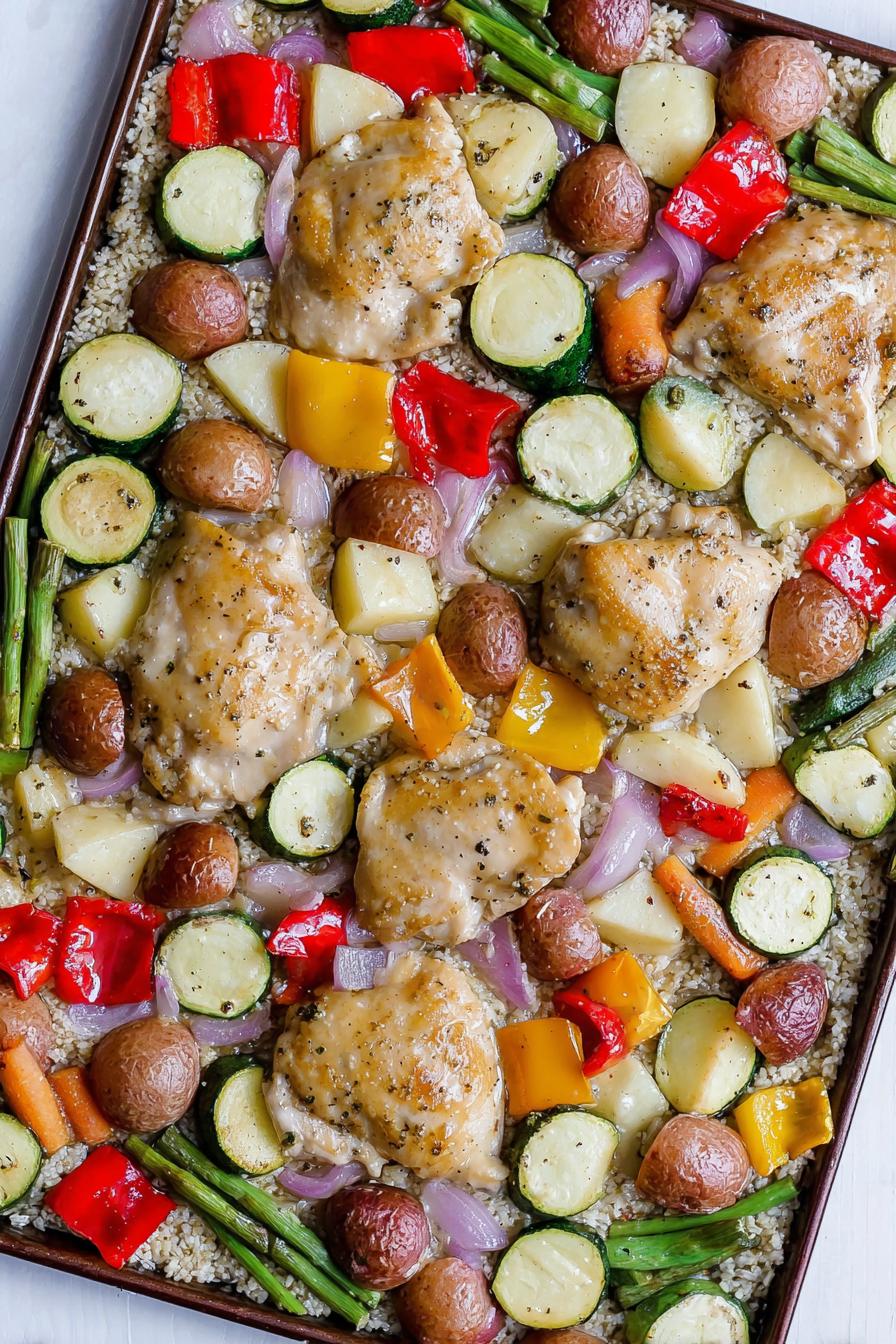 Prato assado no forno, mistura coxa de frango dourada e legumes coloridos sobre uma cama de arroz pré-assado, temperado com um molho levemente adocicado e ácido. O arroz ganha textura levemente crocante nas bordas graças ao forno, enquanto o frango cozinha lentamente, absorvendo sabores. Legumes ao redor trazem frescor e variedade. Receita rende 4 porções, serve como jantar único, combina toque adocicado do xarope de bordo com a acidez do vinagre de arroz e o aroma do alecrim fresco, sem complicar na limpeza da cozinha.