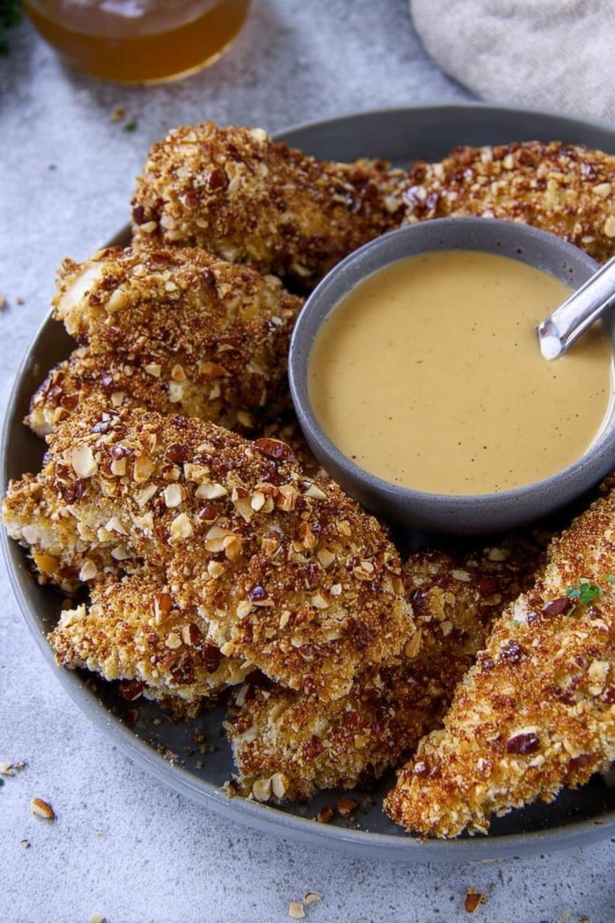 Tiras de frango empanadas com crosta de pretzel triturado, marinadas num molho de mel, mostarda e iogurte, assadas no forno ou fritas na airfryer até atingirem 74° C. Textura crocante, aroma cítrico e toque picante do páprica defumado. Molho para mergulhar feito da mistura original reservada. Substituição do iogurte no lugar do leite de manteiga e páprica defumada no lugar da pimenta caiena para uma variação de sabor. Tempo de marinada e de cozimento ajustados para evitar ressecamento.