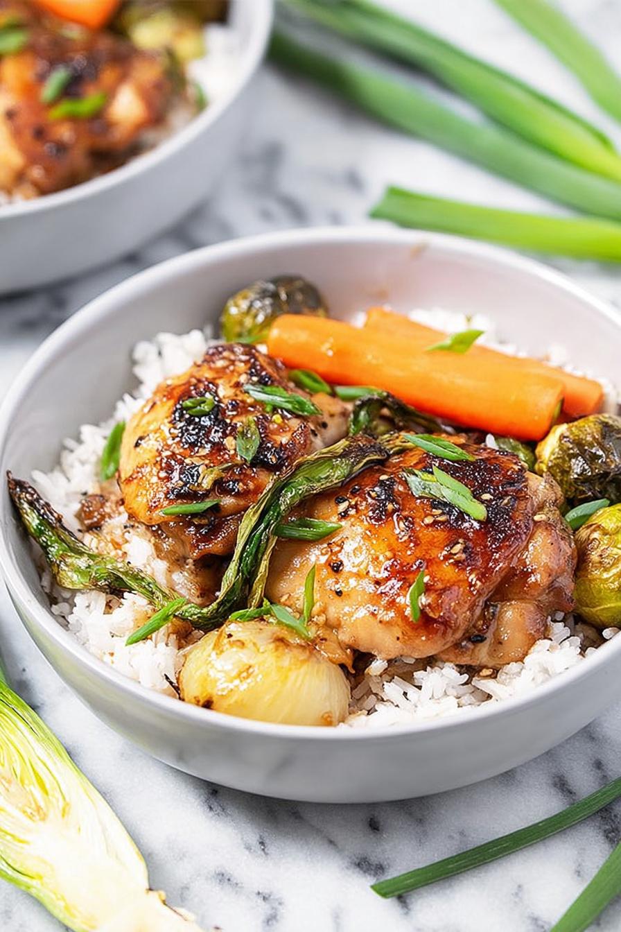 Frango marinado com mel e alho, acompanhado de legumes assados. A marinada combina azeite, alho em pó, mel, caldo de galinha, vinagre de arroz e molho hoisin. O prato é assado até dourar, com toque final de cebolinha fresca. Versão adaptada com suco de maracujá no lugar do caldo e abobrinha no mix de legumes. Os tempos e proporções foram ajustados para melhor textura e sabor com menos chá de forno. Fácil, prático e com truques para evitar frango seco ou legumes crus. Serve 4 pessoas com arroz branco opcional. Cuidado para não deixar a marinada queimar, verdadeiro fator que define crocância e suculência.