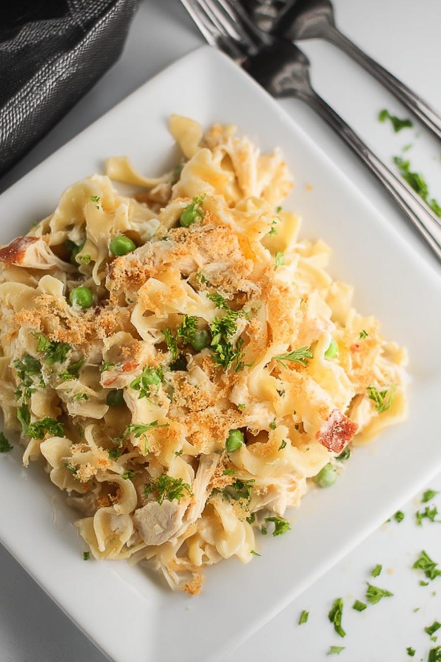 Um prato cremoso de frango desfiado com macarrão tipo egg noodle, coberto com uma crosta dourada de queijo parmesão e farinha Panko. A mistura leva creme de leite azedo substituto do sour cream tradicional, bacon crocante e ervilhas, entregando textura e sabores contrastantes. Essa versão reduz um pouco o leite e usa creme de ricota no lugar do creme azedo, para uma cremosidade mais leve. O macarrão é cozido até ficar al dente, garantindo que não fique mole demais após assar. Tempos ajustados conforme o forno caseiro; a crosta deve estalar e dourar na hora certa. Apresenta aroma envolvente que lembra aquelas casseroles americanas dos encontros em família, com toque de conforto e rusticidade.