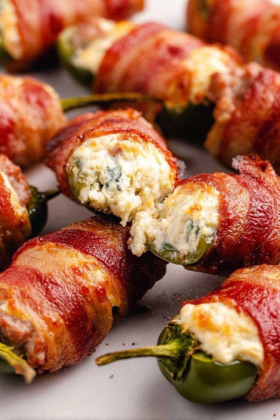 Pimentas jalapeño recheadas com mistura de cream cheese, queijo e linguiça artesanal, envoltas em bacon crocante. Assadas até o bacon dourar sem queimar, criando contraste entre cremosidade e fumacinha salgada. Serve 20 porções pequenas, com toque americano e brasileiro no sal e ingredientes. Fácil, saboroso, bom para petisco em reuniões.