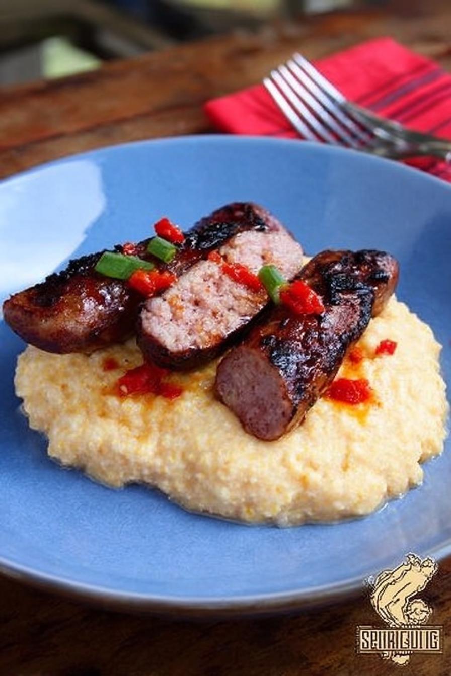 - 💡 Sirva quente. O mingau cremoso e a linguiça caramelizada vão bem juntos. Um toque de azeite por cima é bem-vindo. Ajuda no aroma. Saladas amargas equilibram a refeição pesada. A apresentação conta muito.