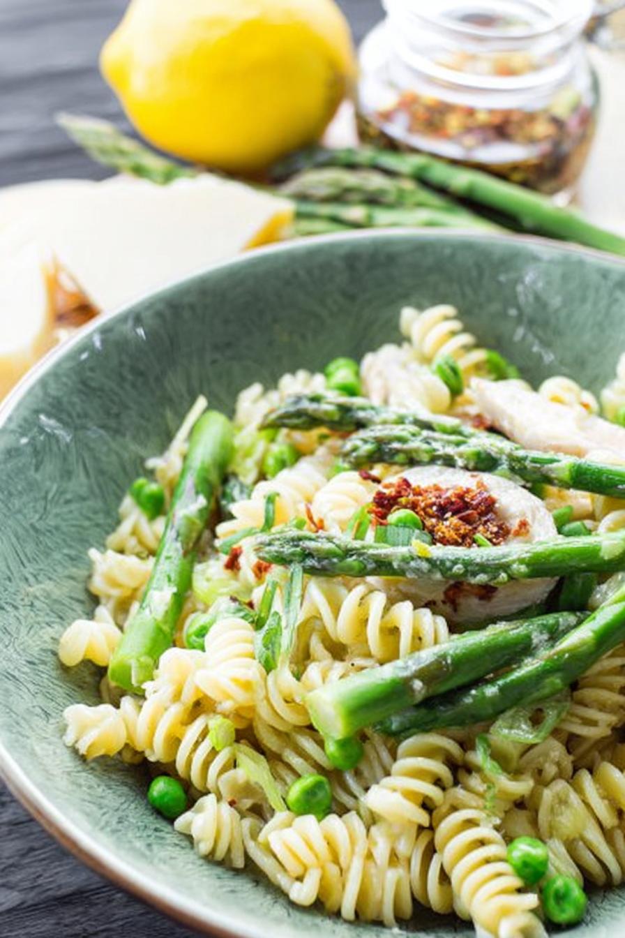 Massa cozida até ponto firme, legumes na medida certa pra manter crocância, molho cremoso com toque cítrico e leve picância, equilibrando texturas e sabores. Aspargos ganham brilho e cor vibrante, ervilhas entram para doçura natural. Molho feito na panela, misturando manteiga, alho, caldo vegetal, amido de milho, creme fresco, limão e pimenta vermelha, dando corpo e acidez que corta gordura. Finaliza com frango grelhado e parmesão ralado na hora, trazendo salinidade e sabor umami. Fácil e rápido para almoço esperto, sem segredo, com espaço pra variações na proteína ou cremes alternativos. Aprende a sentir ponto do molho e cozimento da massa pelo toque.