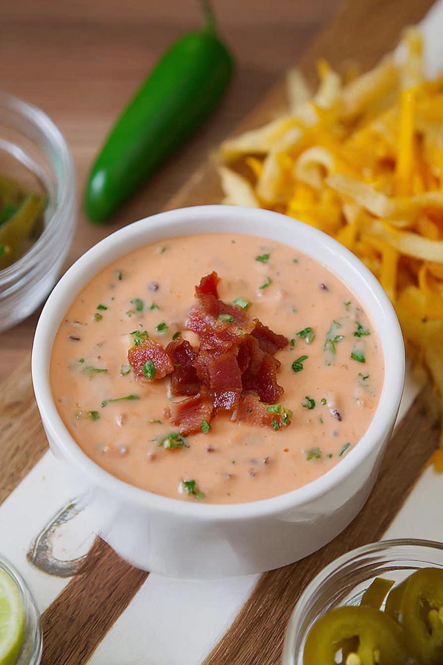 Combinação de ketchup, maionese, jalapeños picados, mostarda, vinagre, pimenta-do-reino e açúcar com bacon crocante incorporado à mão. Temperos balanceados para uma explosão de sabor equilibrada entre picância e defumado, com textura cremosa e pedaços suculentos. Resfriado por tempo suficiente para apurar sabor e dar liga. Serve bem como acompanhamento para hambúrgueres, batatas fritas ou petiscos. Receita rápida, fácil e versátil, com pequenas adaptações para ajustar intensidade e textura. Experiências no preparo revelam como nuances de picância e equilíbrio ácido podem ser ajustados usando ingredientes alternativos e mudança leve no processo.