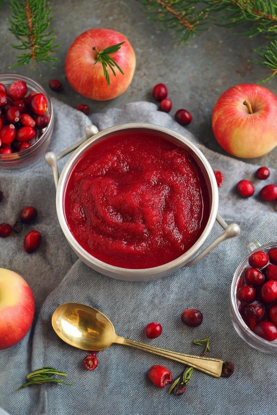 Uma mistura ácida e adocicada de maçãs, cranberry e suco de maçã, processada até virar um molho cremoso. O toque sutil do açúcar balanceia a acidez das frutas. Rápido e fácil, pode ser consumido quente ou gelado, ótimo para acompanhar assados e sobremesas. Adapta-se com especiarias como canela ou noz-moscada, e permite trocas simples nos ingredientes, conforme o que tem em casa.