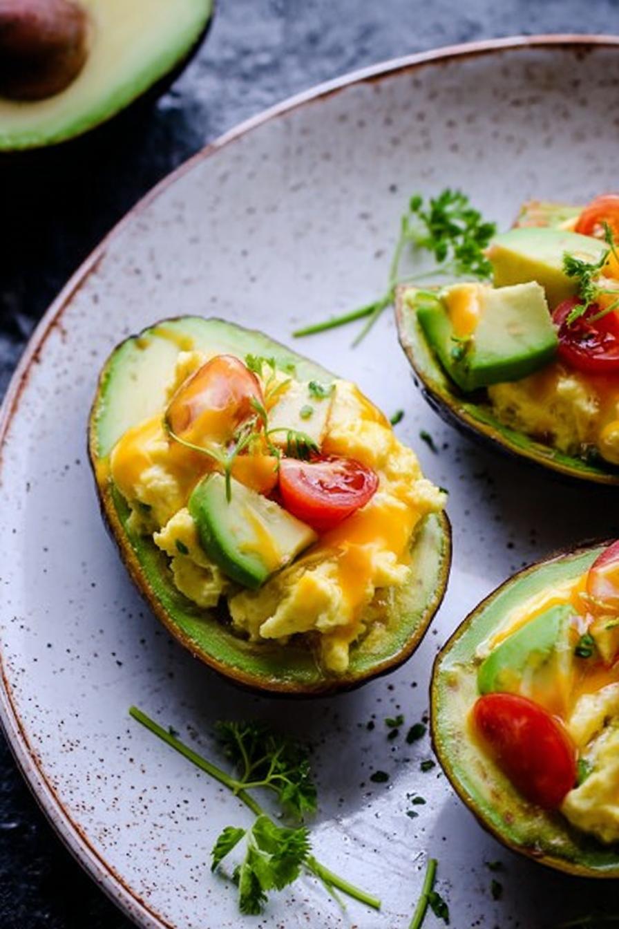 Ovos mexidos cremosos com queijo derretido, servidos em cavidades de abacate que funcionam como tigelas naturais. Temperos simples realçam o sabor, com opção de tomate e brotos para frescor. Preparação rápida, cozinha rápida. Abacate evita o uso de pão, deixando a receita mais leve e nutritiva. Combinação rica em gorduras boas, proteína e toque ácido dos tomates. Versátil, pode trocar o queijo básico por outro de sua preferência, trocar o azeite por manteiga se quiser mais sabor. Ideal para café da manhã ou lanche reforçado, serve até quatro pessoas com generosidade.