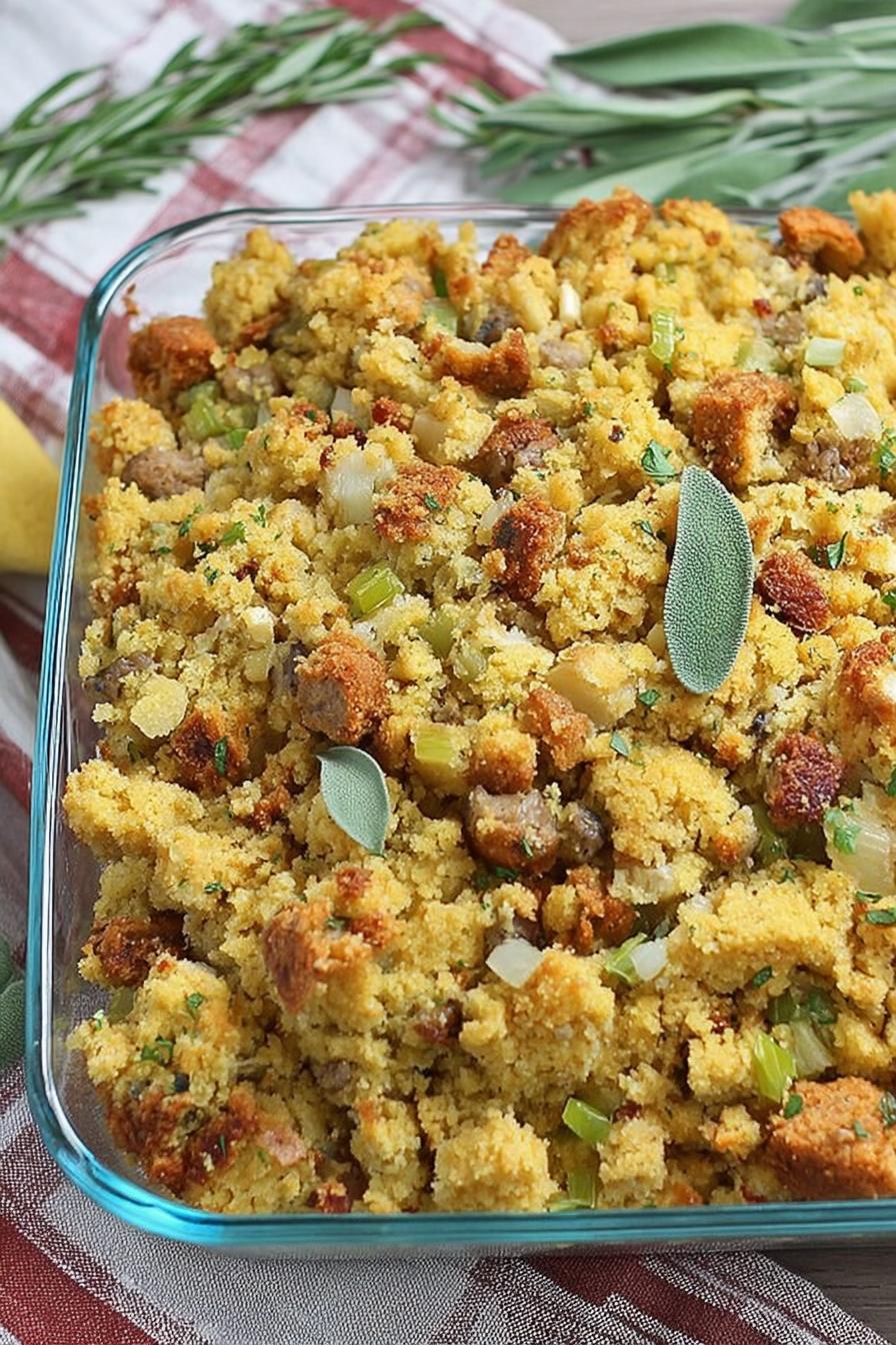 Recheio feito com pão de milho caseiro tostado, refogado de cebola e aipo, ervas frescas e caldo ajustado para textura ideal; cozido até dourar. Versão adaptada com farinha de mandioca e um toque de noz-moscada no tempero. Ingredientes e tempo de forno ajustados para evitar ressecamento. Combina fermentação leve da buttermilk com ovos batidos para liga e sabor. Recheio crocante por fora, úmido por dentro. Serve para jantares especiais ou festas tradicionais. Serve até 12 pessoas.