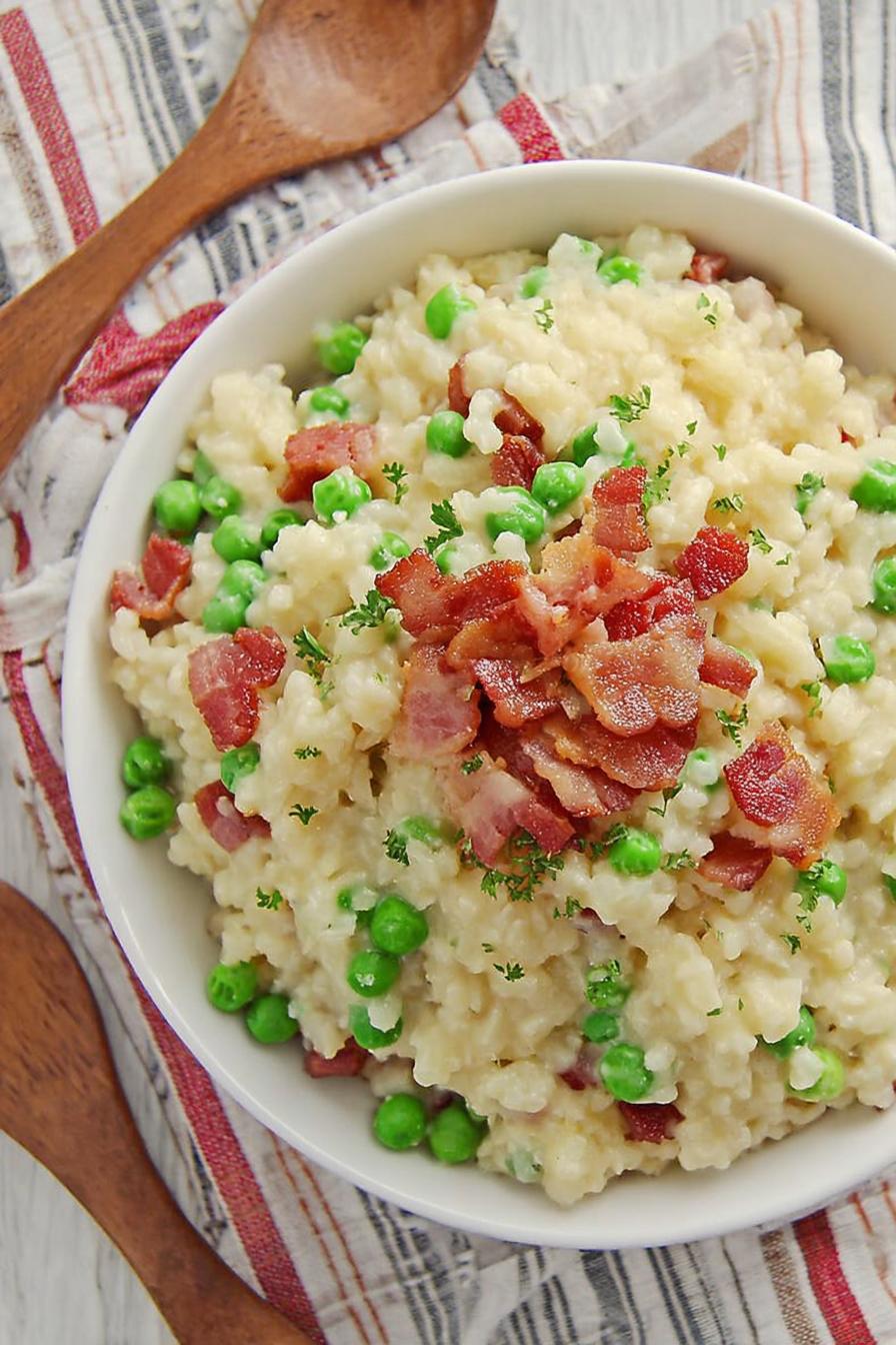 - 💡 As ervilhas entram por último. Não precisa muito tempo. Três minutos é suficiente. Não quer que elas fiquem murchas. Verde vibrante é o que você busca. A pancetta volta pra panela, suculenta. Mistura tudo até esquentar bem. O aroma é incrível, textura manter crocante.