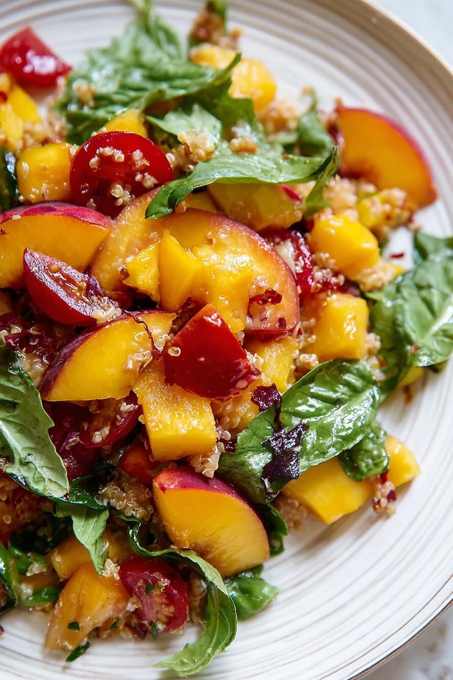 Trocar os pêssegos por nectarinas ajuda a manter a salada com textura firme, evitando que fique encharcada. O vinagre de maçã é suave, mas balsâmico pode substituir trazendo profundidade e doçura natural. Alho fresco picado na medida certa é crucial pra não se perder no azeite mas aparecer no final. Tomates cereja são protagonistas — prefira aqueles firmes e maduros, sem machucados para evitar um vinagrete aguado. Manjericão sempre fresco, rasgadinho à mão, pra não oxidar. Se não encontrar burrata, bolinhas de mussarela caem certinho, trazendo cremosidade e frescor. Sal e pimenta são a base do tempero, coloque aos poucos e ajuste sempre com o gosto dos demais ingredientes frescos já misturados.