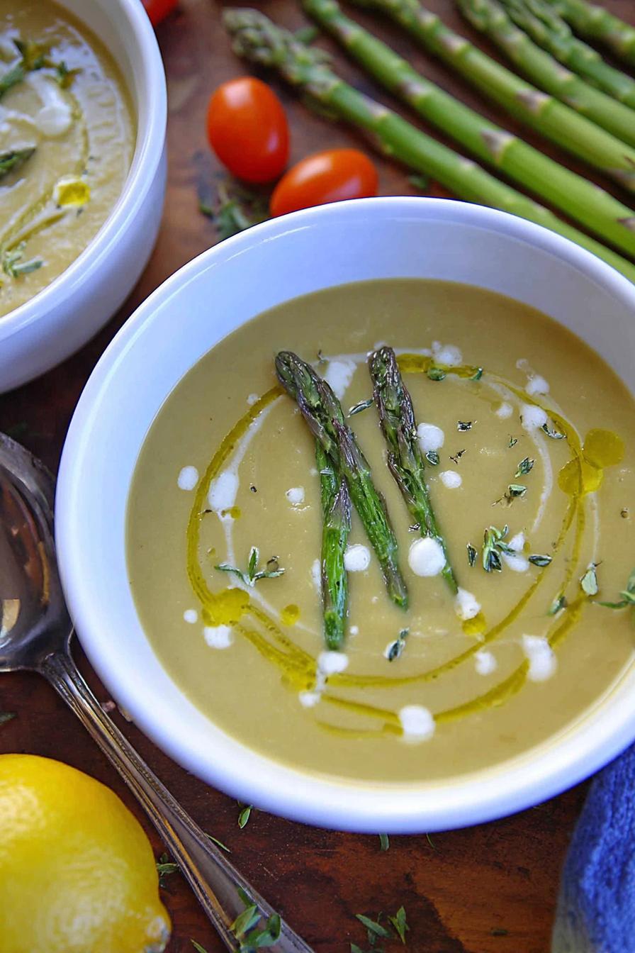 Sopa aveludada feita com aspargos frescos, cebola e um toque de creme de leite. Usa caldo de legumes para um sabor leve, com espessante natural e uma acidez sutil de limão. Textura lisa com pedacinhos crocantes no topo para contraste. Fácil de preparar, requer atenção visual para o ponto certo dos aspargos e cebolas, e um bom equilíbrio entre temperos para não deixar a sopa enjoativa.