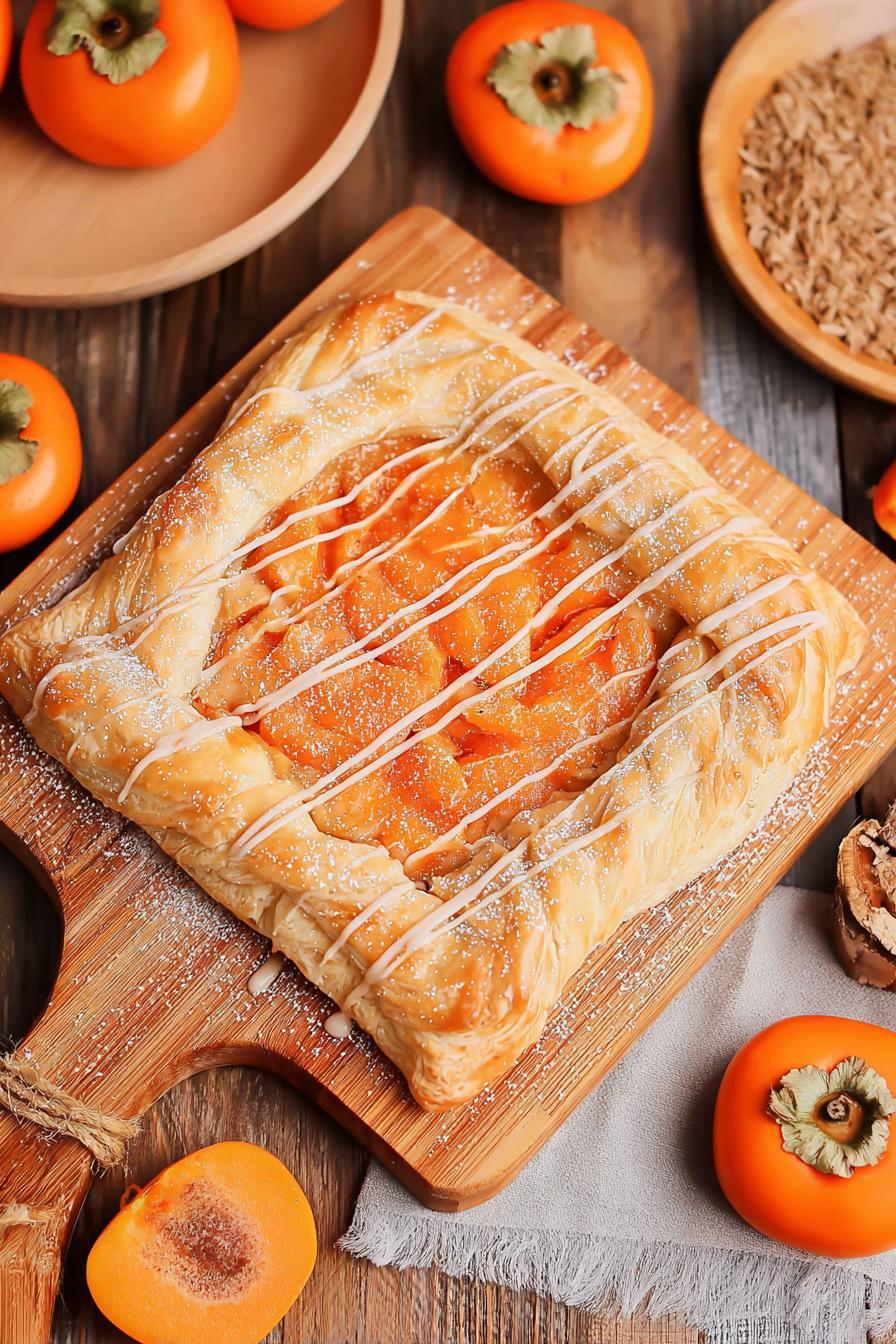 A torta mistura massa folhada crocante com um recheio cremoso e frutas doces. O caqui fatiado dá um visual vibrante e sabor suave, contrastando com o toque amanteigado da massa. Um creme feito com cream cheese, açúcar mascavo e especiarias traz uma base aromática que equilibra o doce natural da fruta. Finalização com glacê de maple e açúcar turbinado realça as camadas de textura. O preparo prioriza texturas e aparência rústica, valorizando os aromas que surgem no forno, com toque especial na escolha de ingredientes e ajustes finos no tempo de cozimento. Serve quatro e cai muito bem com sorvete de baunilha.