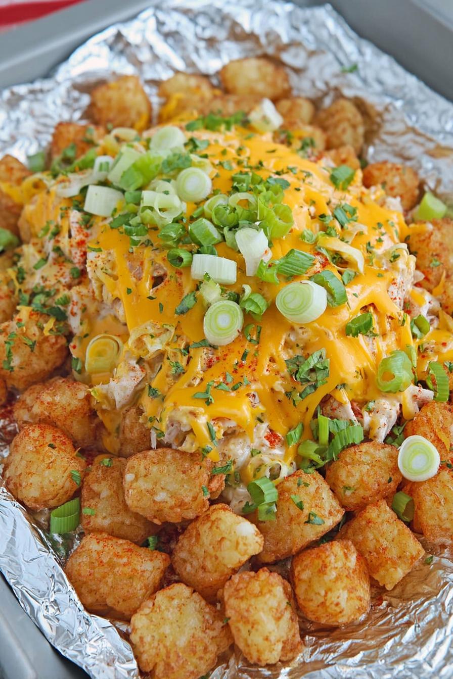 Esquenta rápido a cozinha quando resolve preparar uns totchos. Essa mistura de tater tots crocantes com um dip cremoso de caranguejo é minha arma secreta para petiscos que todo mundo lembra depois. O segredo está nas texturas – batatinha estalando, dip macio e cheio de sabor marítimo, finalizado com um queijo derretido que chama atenção. Já testei com várias combinações; o limão-siciliano é tiro certo para equilibrar a gordura do cream cheese. Mas o que não pode é abrir mão do toque final: sal Maldon jogado por cima, que dá um click a mais. Como uma sobremesa na boca, total entrega. O método? Simples, mas com paciência no forno até ficar com a crocância boa, que não desgruda do dente na hora certa. Pronto para se sujar um pouco.